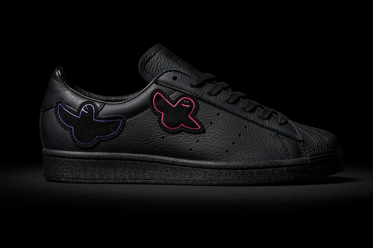 Para esta nueva oferta, Gonzales adopta un enfoque minimalista pero efectivo. La parte superior de cuero de primera calidad, las lengüetas y los exclusivos dedos de los pies están cubiertos de negro y las rayas se han reformateado con la estética punteada de una sola fila que se asocia más comúnmente con las Stan Smith . En este caso, se descartó el logotipo habitual de Trefoil en los talones del zapato, y las lenguas llevan una insignia de adidas grabada. Además, los pájaros "Schmoo" característicos de Gonzales llegan en forma irregular en la parte superior, todos los cuales presentan estallidos de colores como verde neón, rojo y morado. Las piezas de la suela de abajo continúan con el tema de tonos más oscuros al llegar también con una apariencia completamente negra.